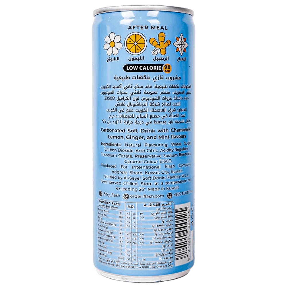 احصل الآن على مشروب فلاش الغازي الأزرق – 250 مل واستمتع بمزيج البابونج والليمون والزنجبيل في تجربة منعشة لا تُنسى.